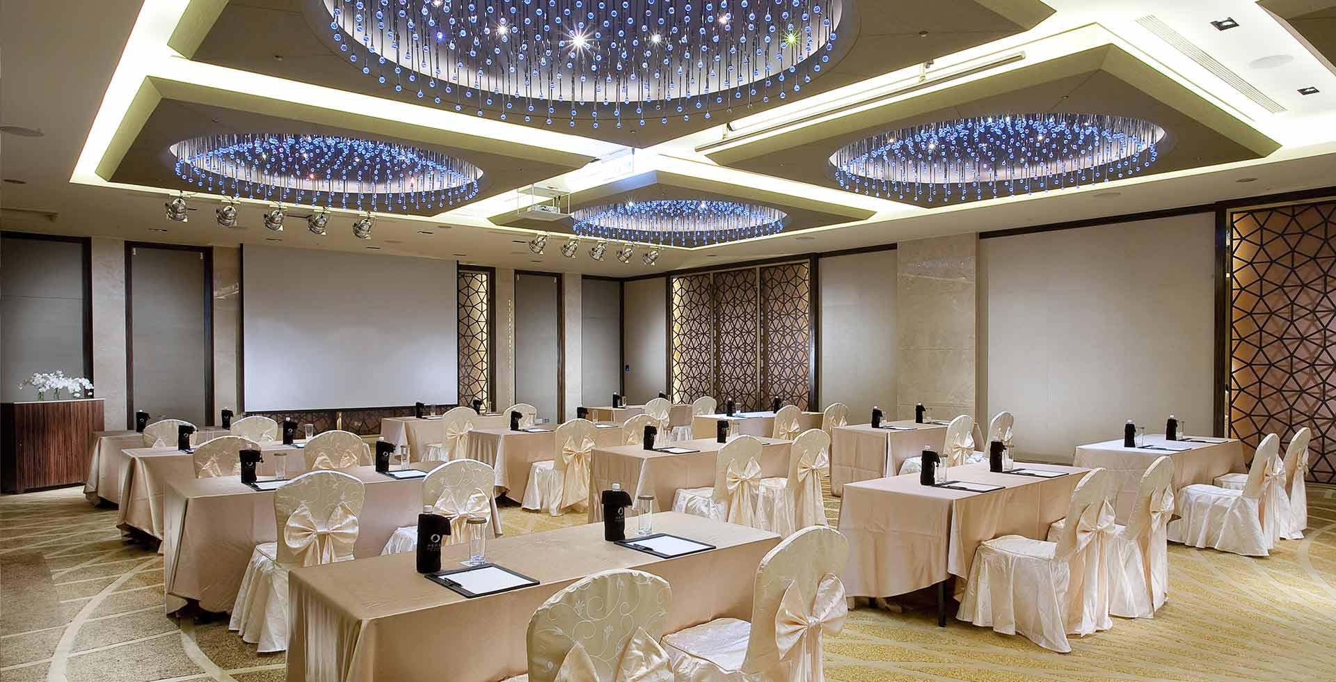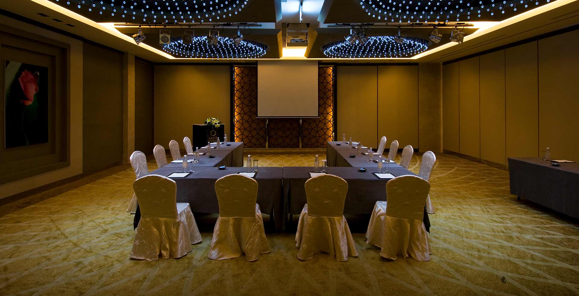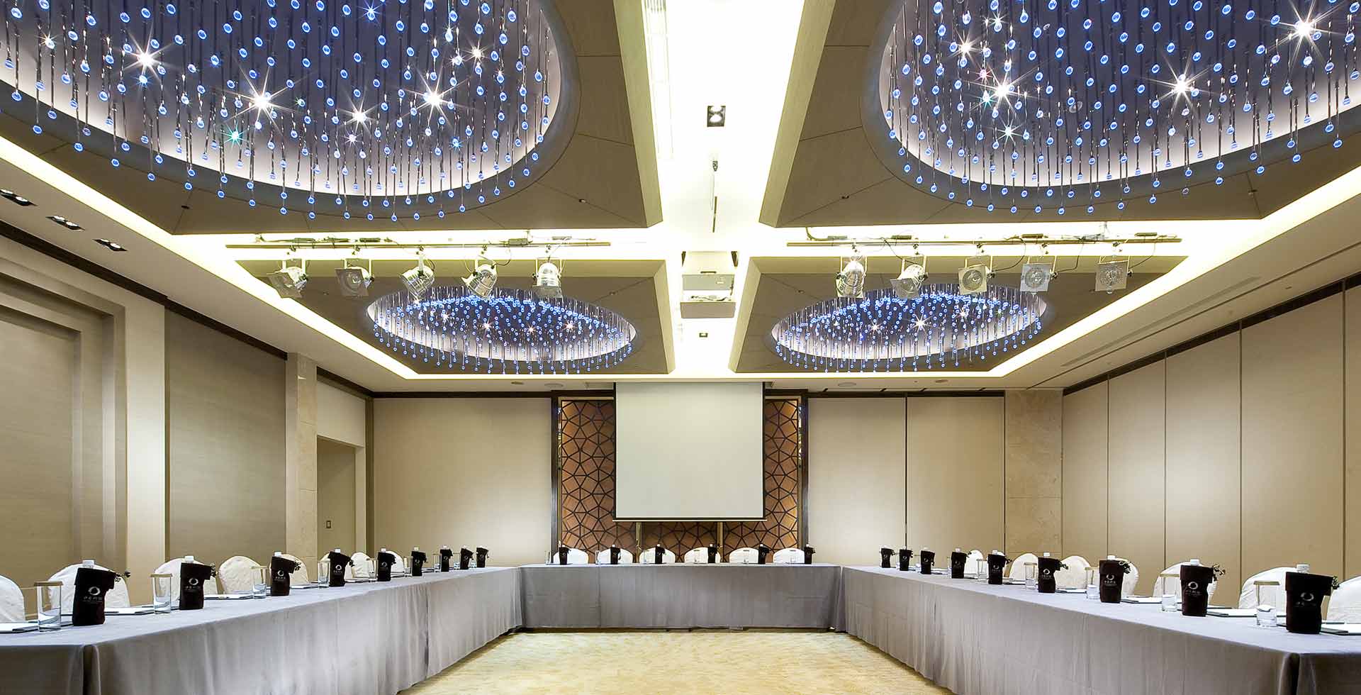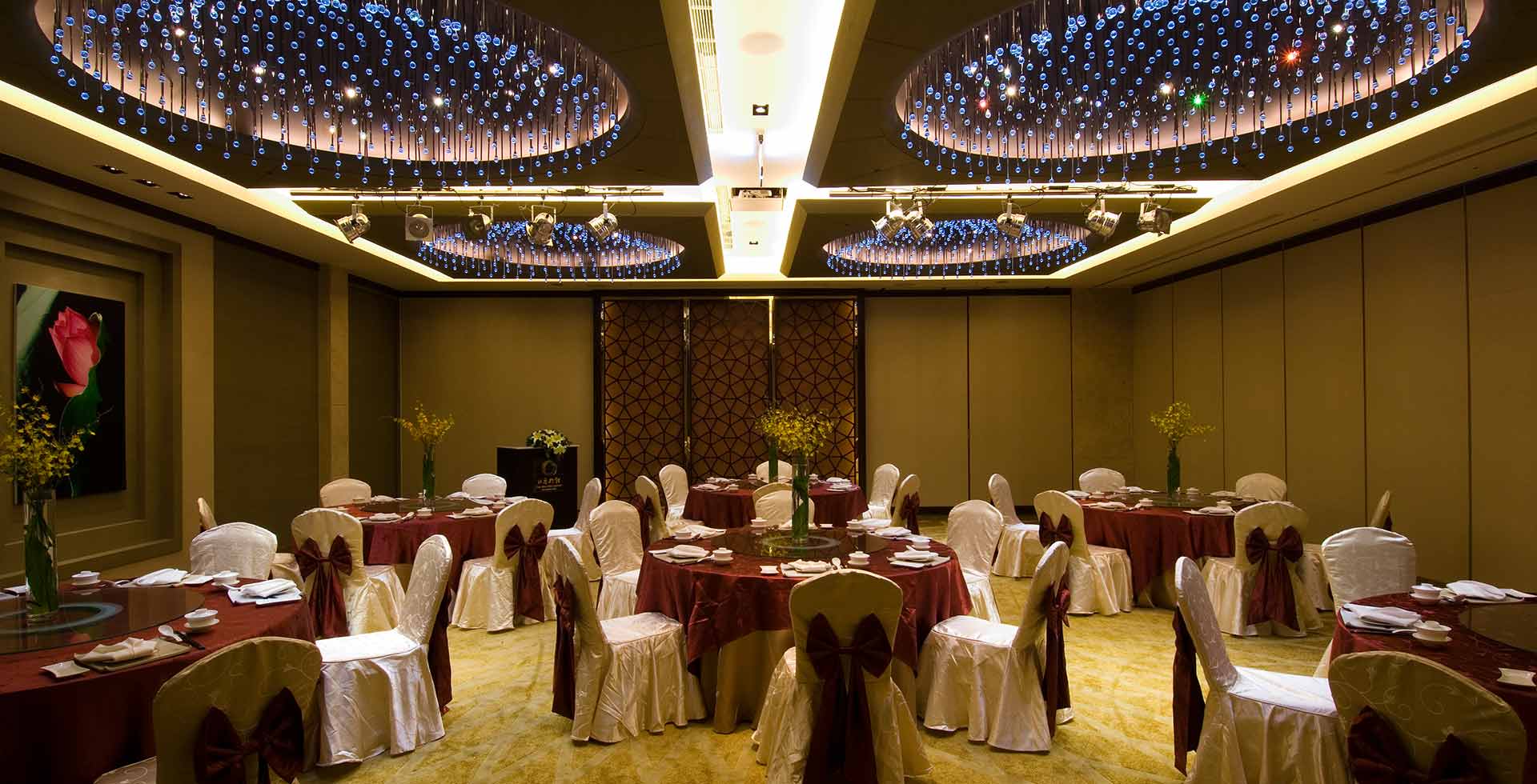 亮麗創新的國際宴會廳,映現出「向陽」的視覺意象,璀璨主燈如太陽花綻放耀眼光芒;地毯的花瓣,則向著太陽舞動著希望。